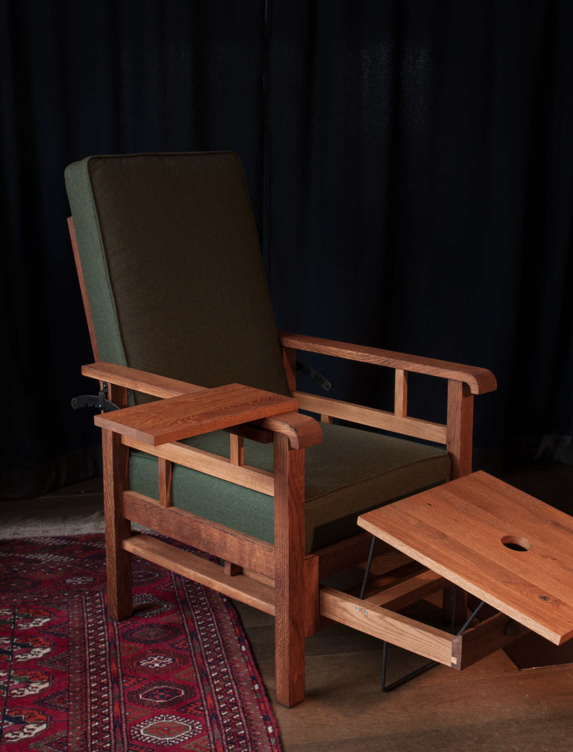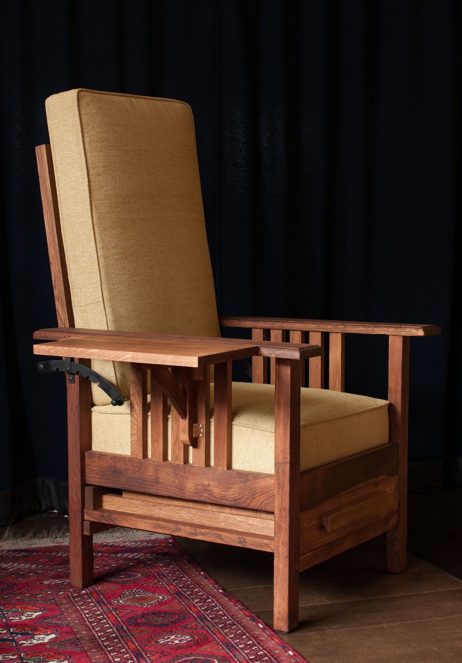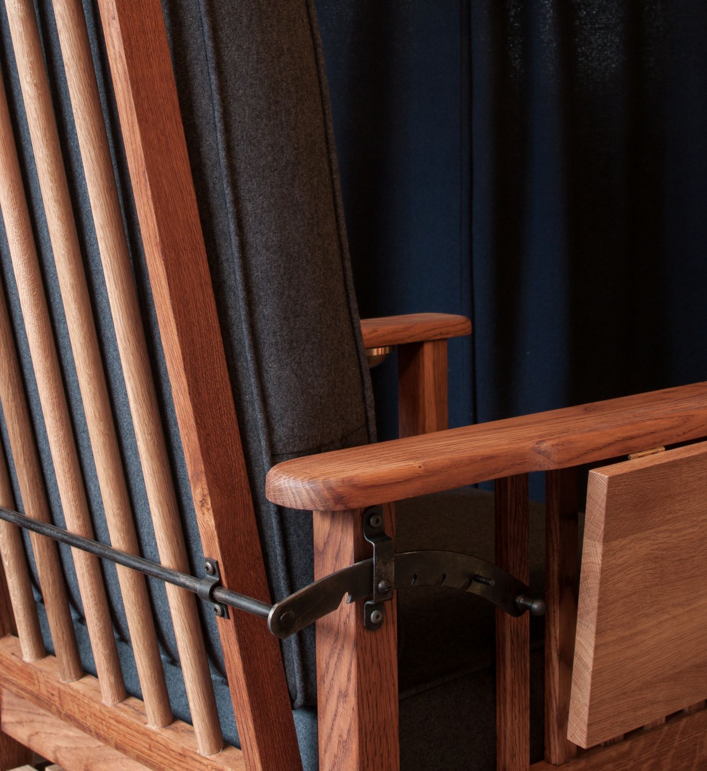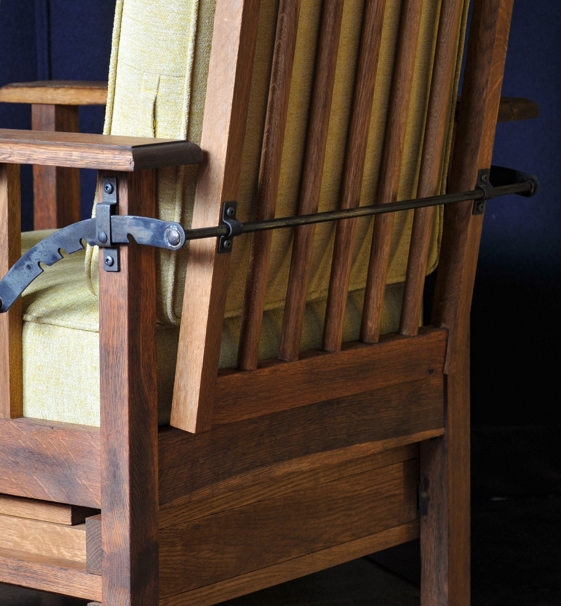 Wir konstruieren und bauen, wenn nötig, Neue aus Eiche und Rundstahl. Alle verbauten Scharniere an dem Stuhl sind aus massivem Messing.